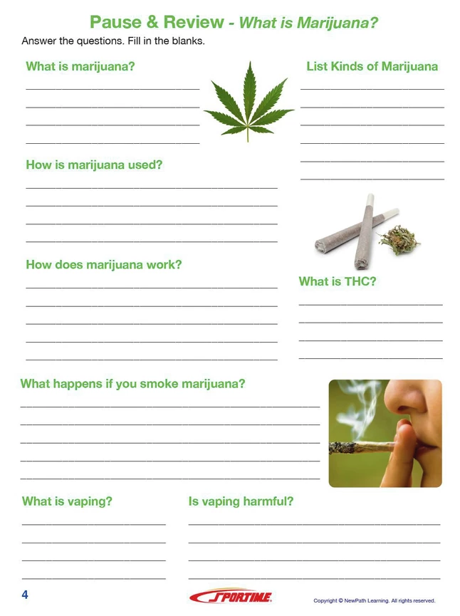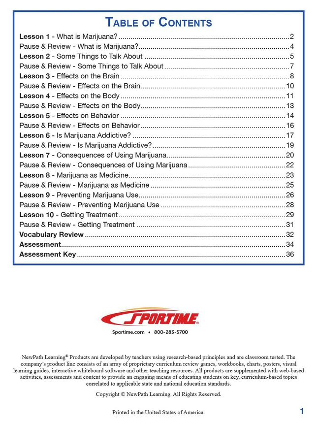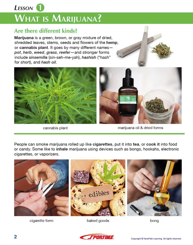Full color guide includes self-directed readings, easy to follow illustrated explanations, pause and review questions, interactive activities, key vocabulary review and assessment questions. Covers what is marijuana?, marijuana’s effects on the brain, body and behavior, marijuana as a medicine, marijuana prevention and cessation strategies. 36 total pages.