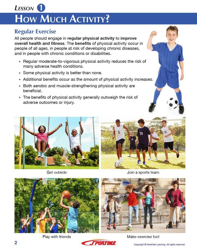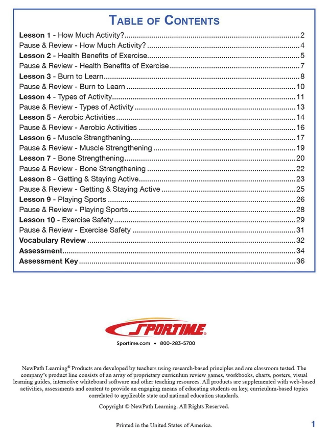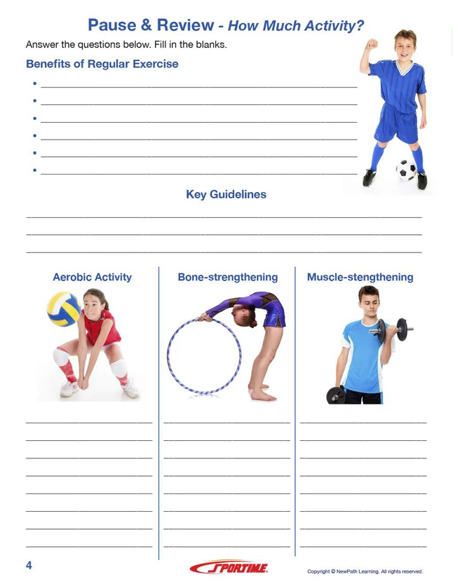 Full color guide includes self-directed readings, easy to follow illustrated explanations, pause and review questions, interactive activities, key vocabulary review and assessment questions. Covers health benefits of exercise, burn to learn, types of exercise, aerobic activities, muscle strengthening, bone strengthening, exercise safety. 36 total pages.