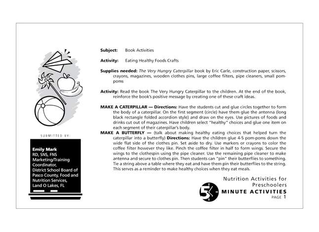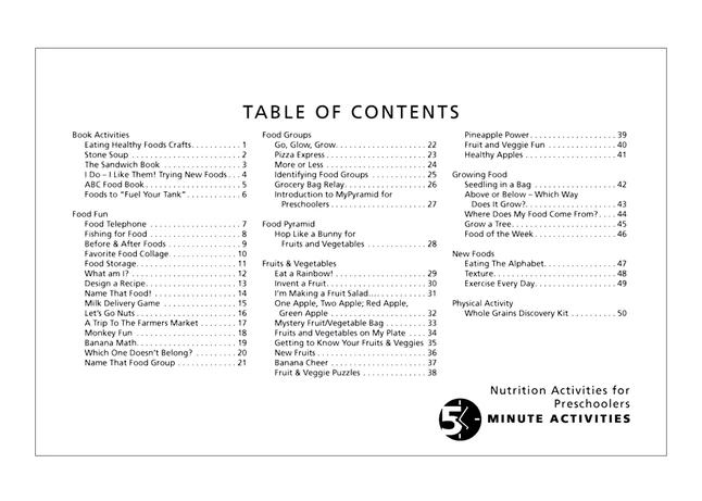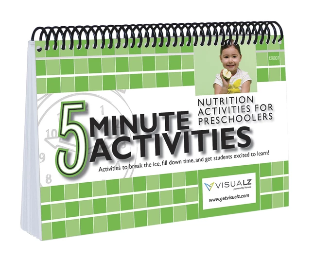 Visualz 5 Minute Nutrition Activities Book for Preschoolers – Use the 5 Minute Activities as quick, easy, and effective activities to break the ice, fill extra minutes of class time and get children excited to learn! Each activity is calculated to last 5-10 minutes. These preschool activities are a great way to introduce basic nutrition lessons, reinforce earlier learning, or to conclude other nutrition lessons. Each activity can be a creative and fun learning experience for kids that allows them to get thinking about nutrition! The book s activities were written by a variety of nutrition and child care professionals. 8-1/2 in x 5-1/2 in spiral bound book. .