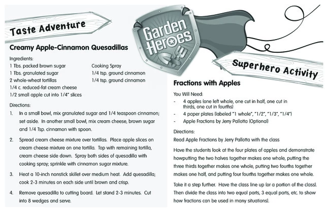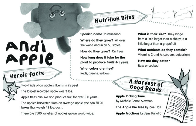 - The book includes: Nutrition Bites: information on the fruit or vegetable including spanish name, where it grows, what it looks like, and how to eat it, Heroic Facts: fun and surprising trivia about the fruit or vegetable, Taste Adventure: a kid-friendly recipe for classroom or home, and Superhero Activity: an activity in math, literacy, art, movement, science, or dramatic play relating to fruits and vegetables