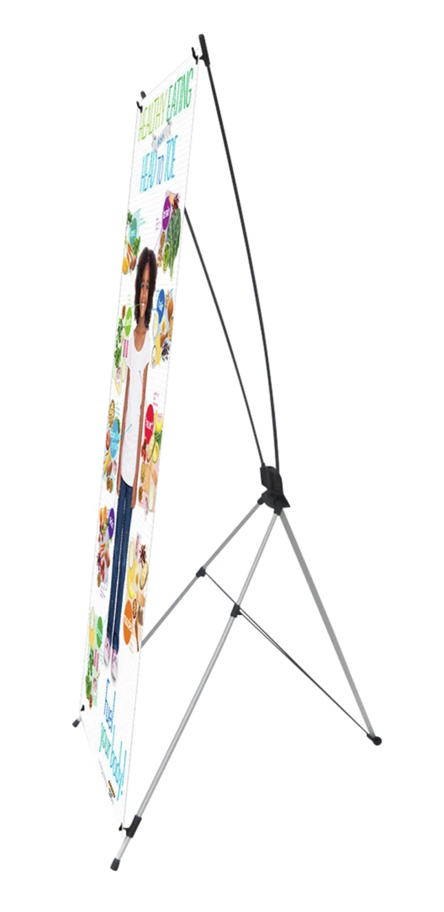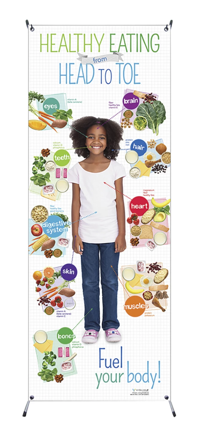 The Healthy Eating from Head to Toe Vinyl Banner with Stand shows nutritious food choices grouped together by the parts of the body they benefit most, including your brain, hair, skin, teeth, bones, heart, muscles, eyes, and digestive system. 24 Inch x 63 Inch full color vinyl graphics and stand. .