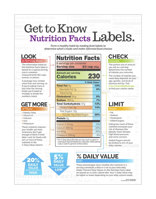The Get to Know Nutrition Facts Labels Poster highlights the different sections of the food label to help consumers determine if a food or beverage is a healthy choice, including a review of serving sizes and calories, nutrients to get more and less of, and an explanation of % Daily Value. 18 x 24 Inches Laminated. .